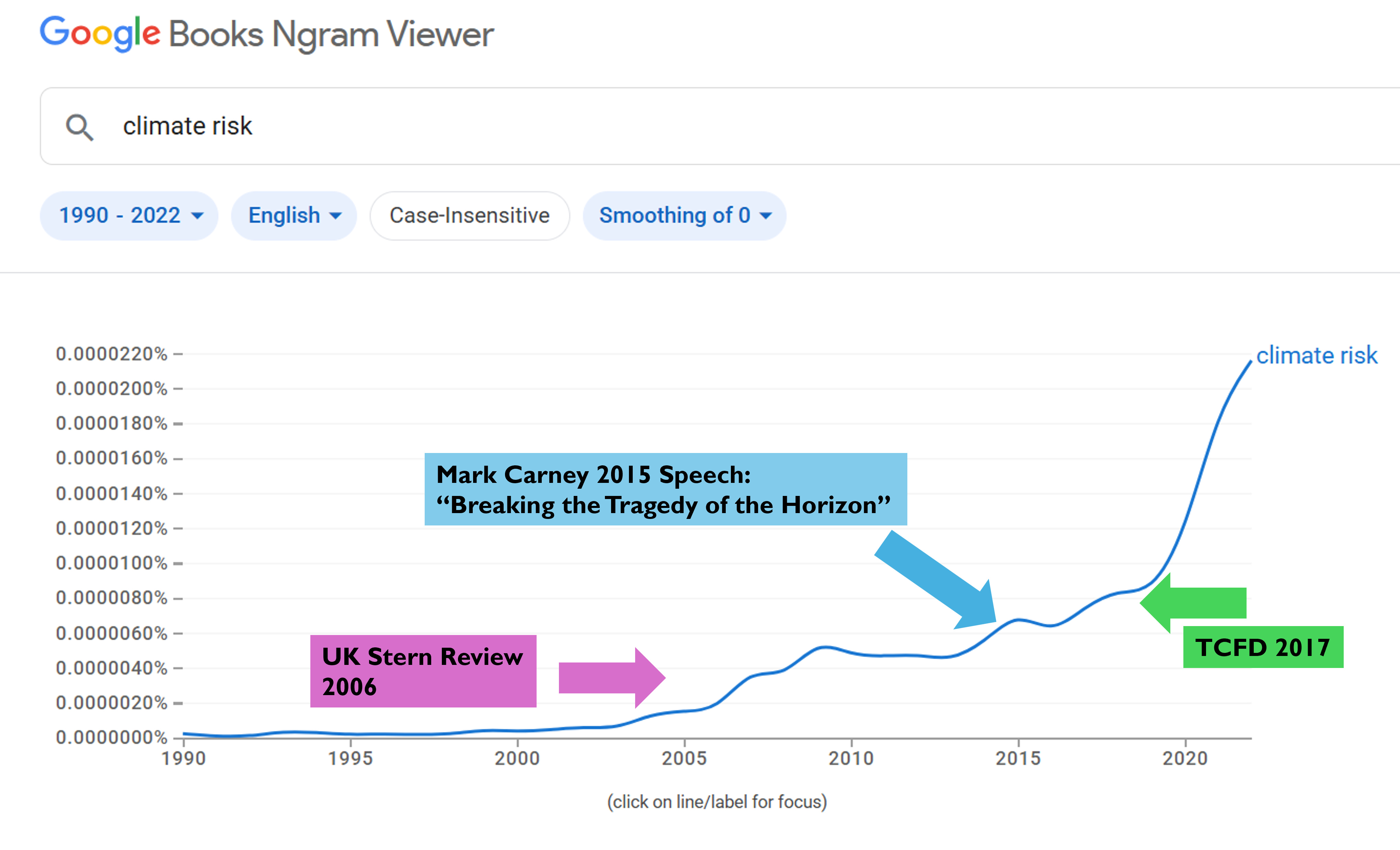 The notion of “climate risk” can be found sparingly in the literature prior to Mark Carney’s 2015 speech that launched the climate-risk industrial complex. The figure below, via Google Ngrams, shows the occurrence of the phrase “climate risk” in English language books published from 1990 to 2022.
