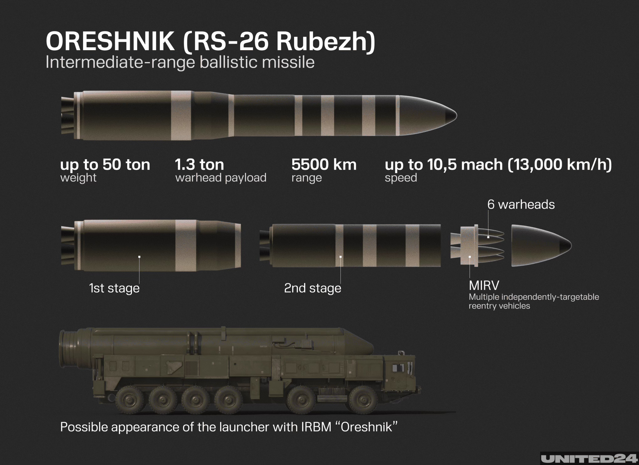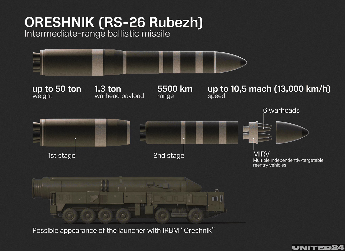 The Oreshnik missile has a range of up to 5,500 kilometres and can mount both single or multiple conventional and nuclear warheads. Travelling at speeds over 12,000 kilometres per hour, this is a missile which very few defence systems can intercept. The excellent Missile Matters Substack had a good feature on this missile back in November 2024, which you can read here. More recently, the United24 website also has an in-depth review of the missile and its capabilities, and that can be read at this link.
