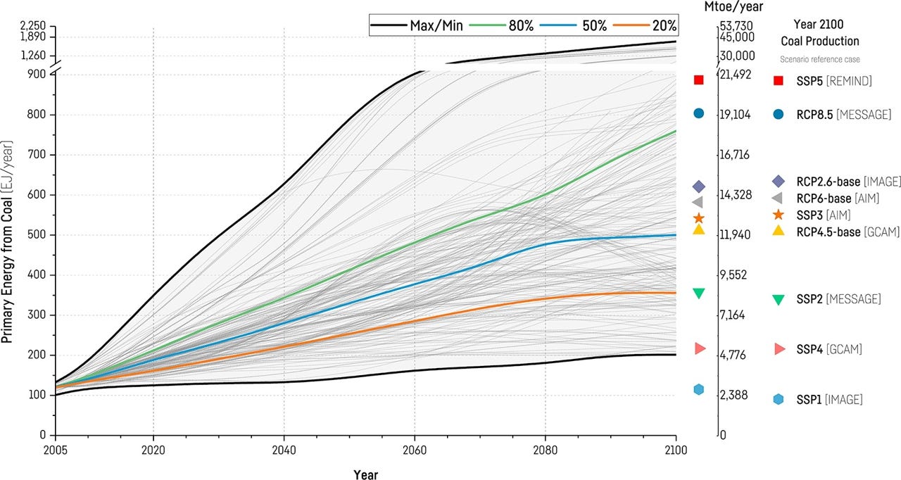 Thousands of scenarios, one common assumption — Coal consumption goes up, up, up. Source: Ritchie and Dowlatabadi 2017.