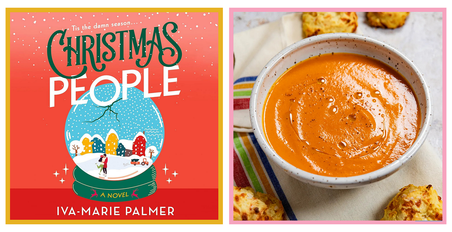 The meal // Creamy but cream-less tomato soup + cheddar biscuits. One of the main guys in the story is a small-town baker, so let’s make some drop biscuits as a baked-good ode