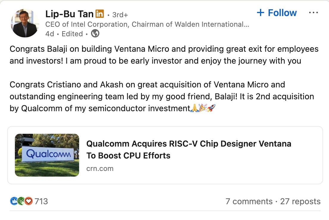 On 10 December Qualcomm announced they were acquiring RISC-V CPU designer Ventana Micro Systems. Like Groq, Ventana was a venture capital backed startup, this time founded in 2018, and which raised over $100m in funding. Investors included Intel CEO Lip-Bu Tan, through his investment firm Walden International. LBT quickly congratulated the Ventana team: