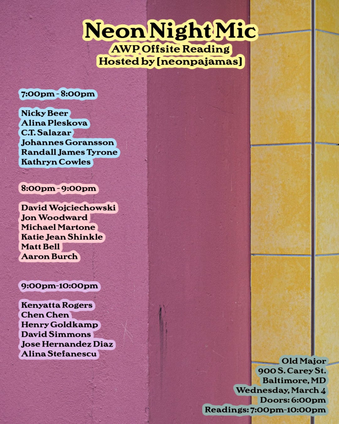 If you’re traveling to AWP this week, I’ve got three events during the conference, starting with the Neon Night Mic reading on Wednesday at Old Major at 900 S. Carey St, where I’ll be reading in the 8-9pm hour. I’m also on two Friday panels, The Art and Craft of the Craft Book at 9am and Rewriting Stories that History Forgot at 1:45pm. I hope to say hi to some of you throughout the week!