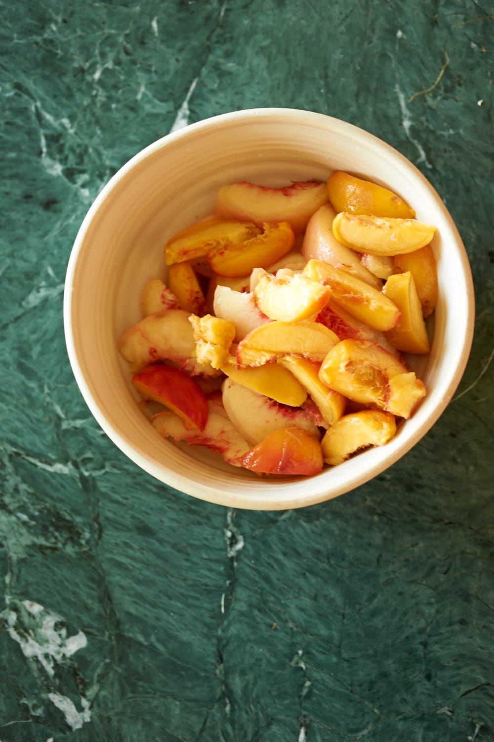 Peel a dozen or so small, fairly ripe (but not soft) peaches by immersing them in boiling water for 15 to 30 seconds. Run them under cold water and watch the skins slip right off. Cut off any brown spots.
