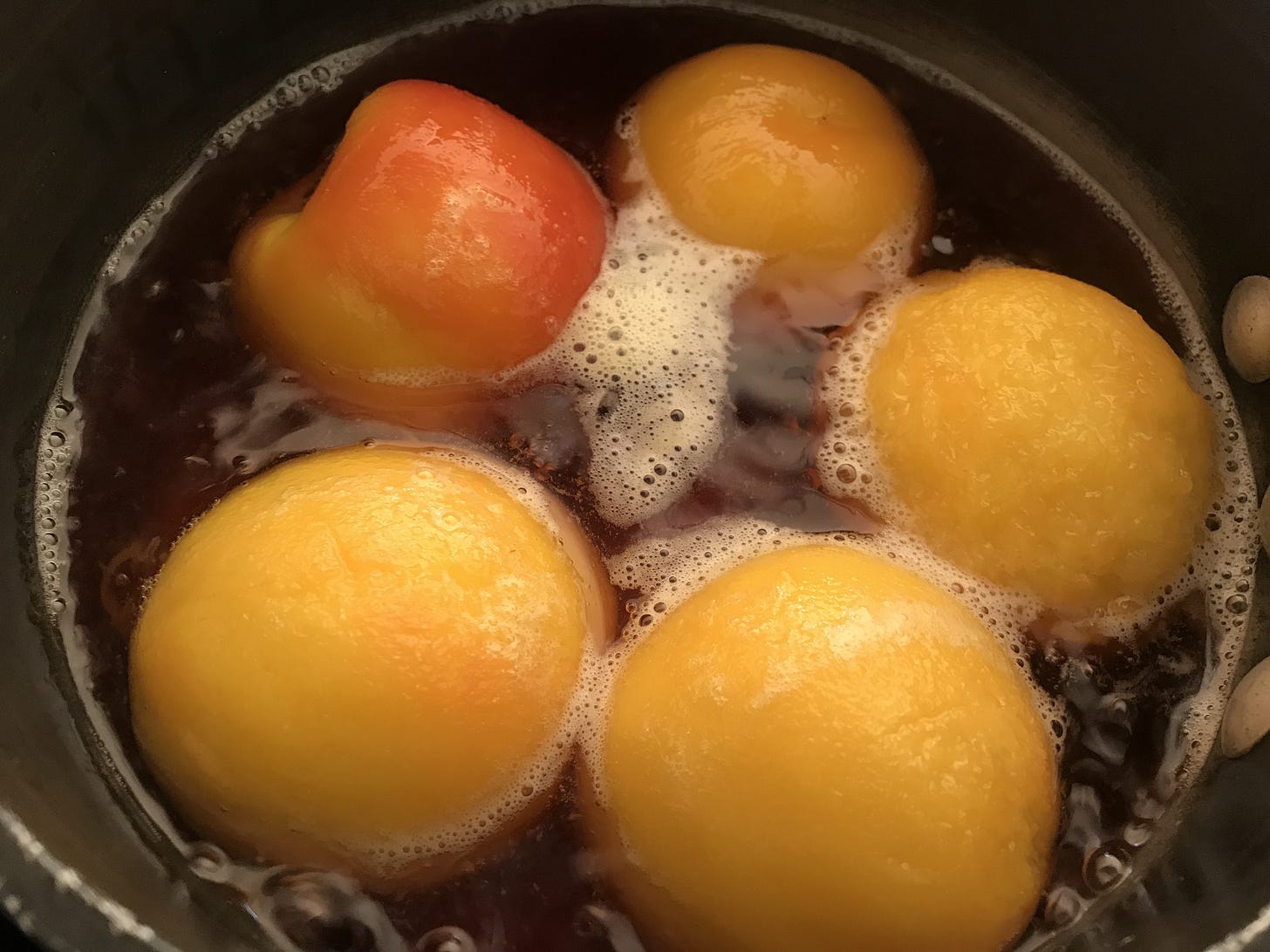 Put 3½ cups of sugar and a cup and a half of plain white vinegar into a heavy-bottomed pot. Add a cup and a half of water and bring to a boil, stirring until the sugar dissolves. Gently slide the peaches into the brine (you will probably need to do this in a couple of batches) and allow them to cook for about 4 minutes, turning them from time to time; you don't want them to get too cooked. Put the cooked peaches into a large bowl.