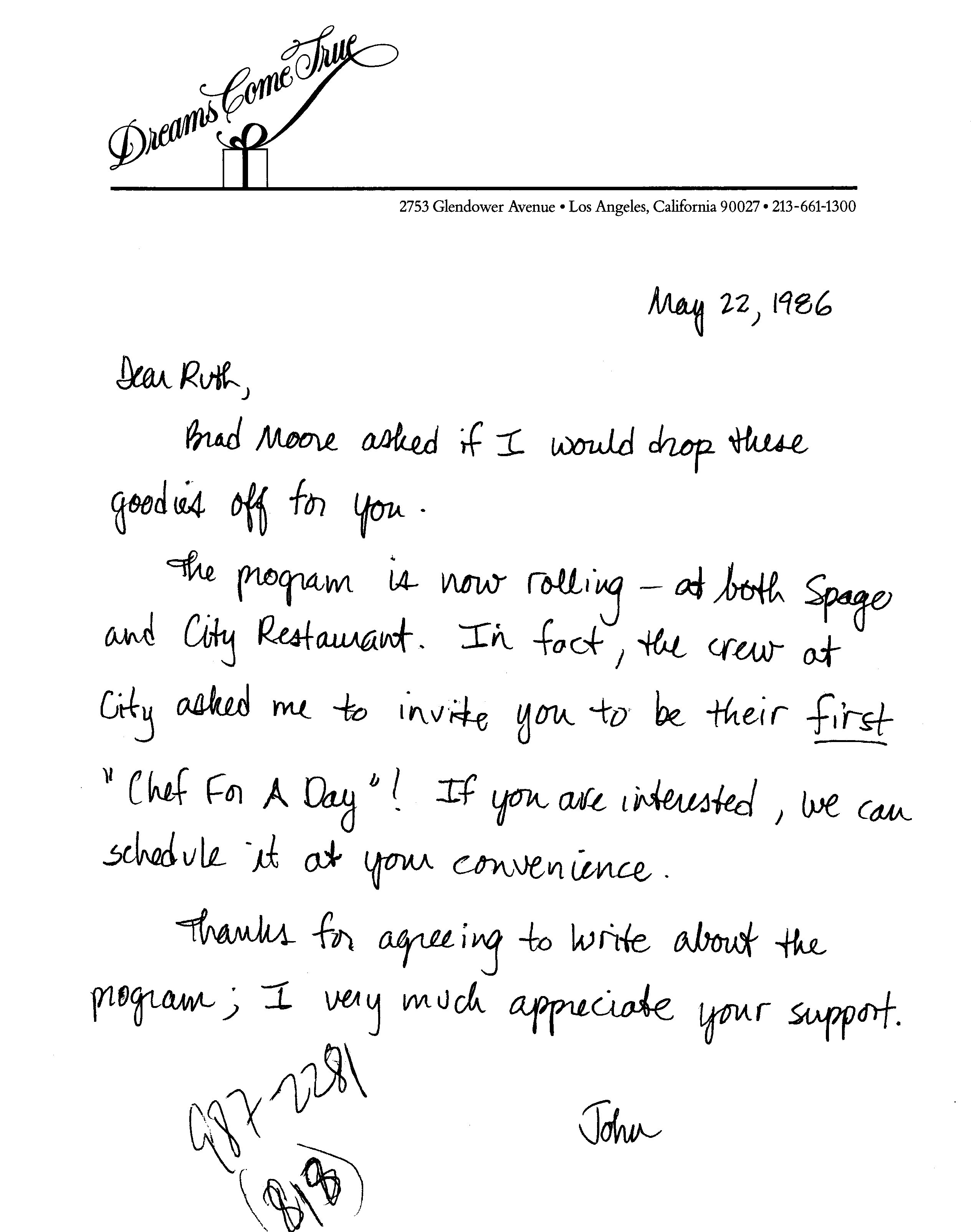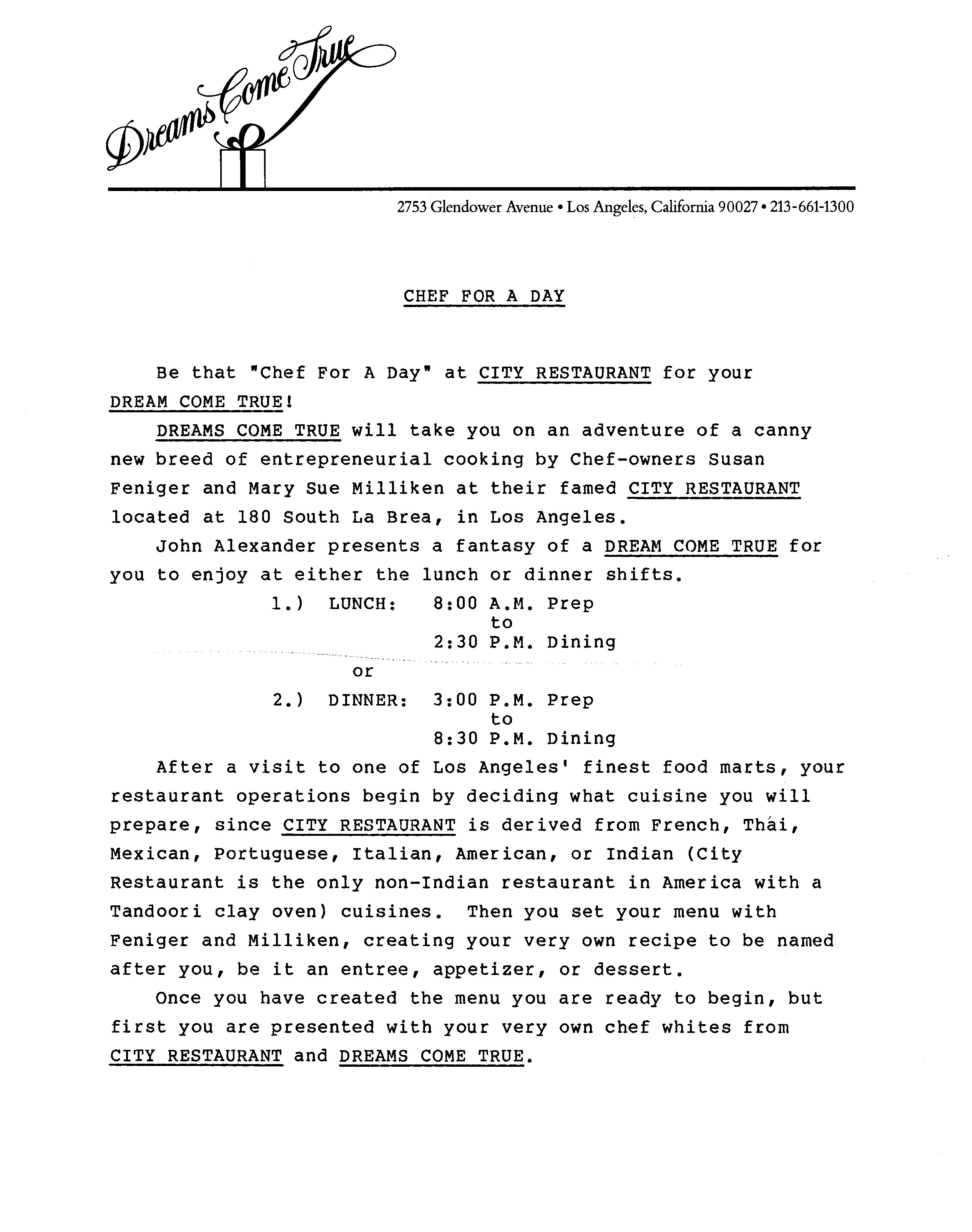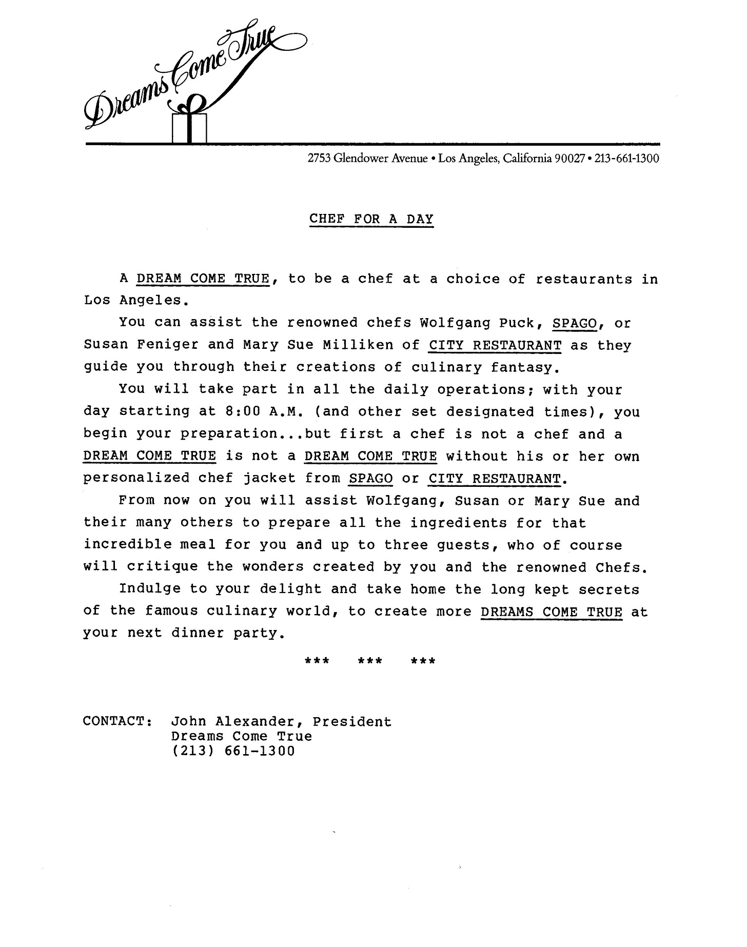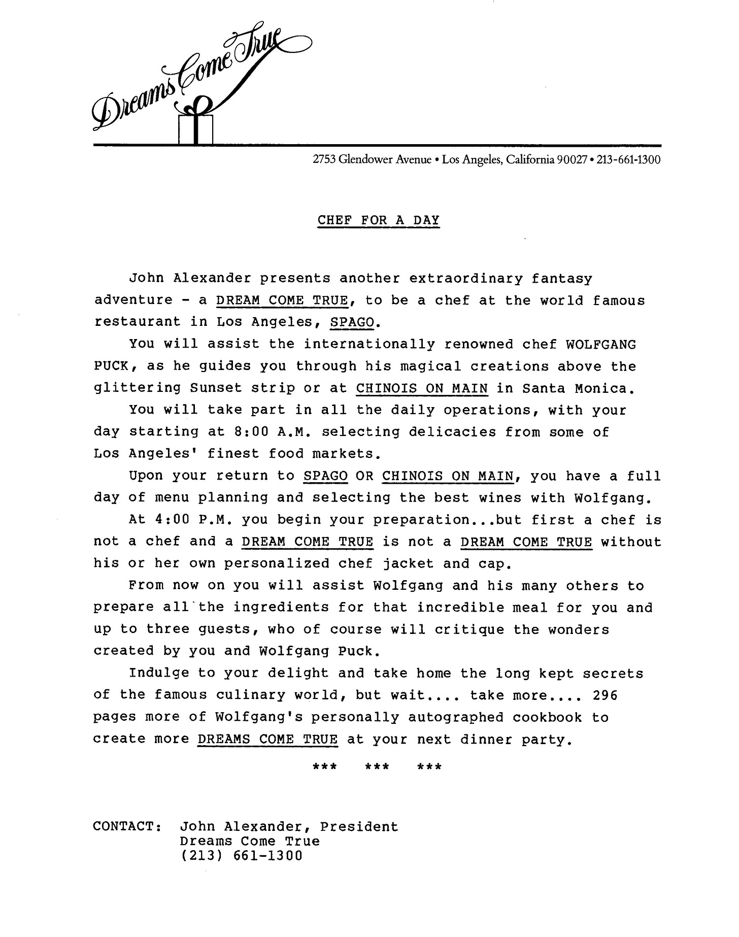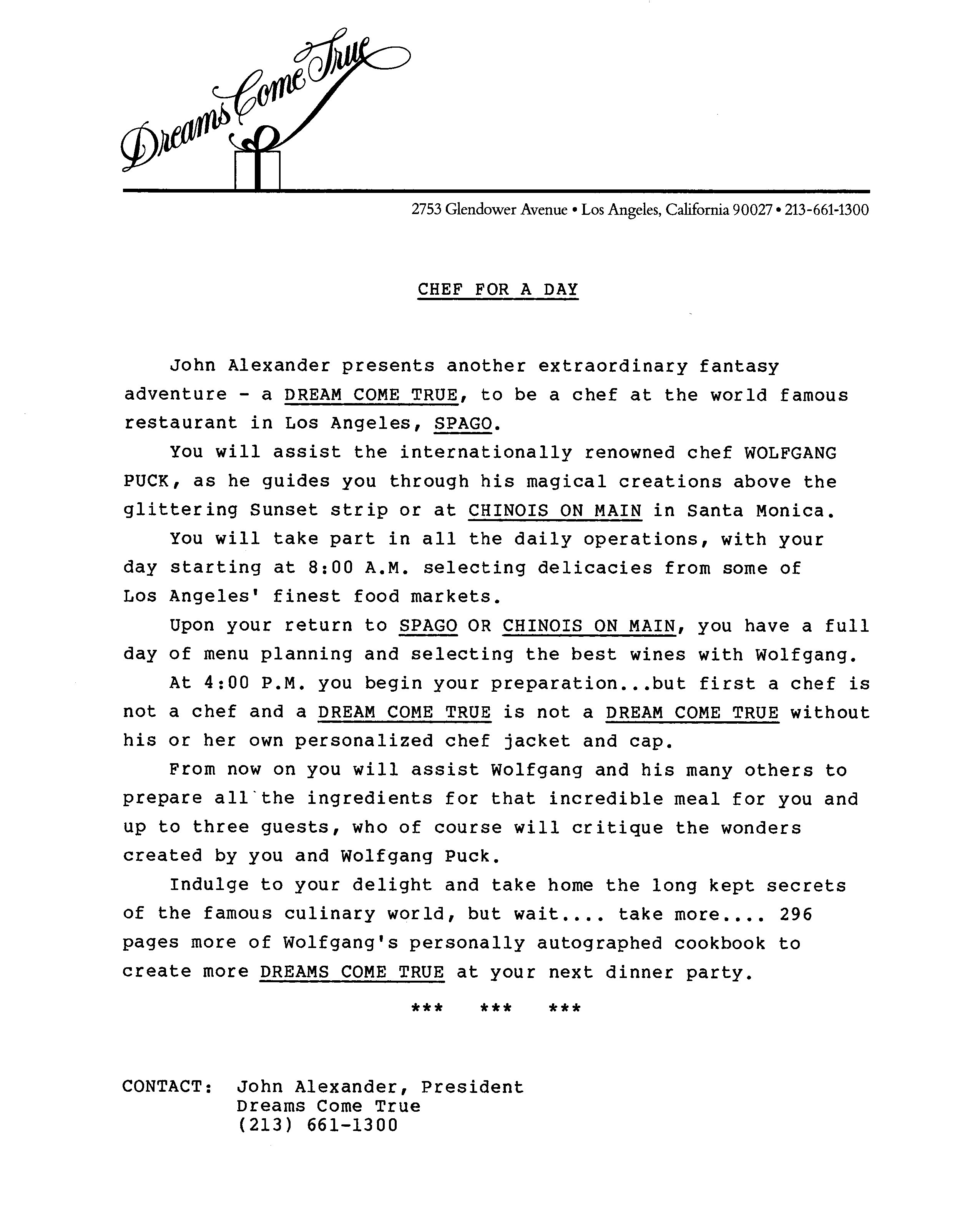 John Alexander, who lived next door to me in Los Feliz, was in the business of fulfilling people’s deepest fantasies. His motto: “We do anything that’s fun and legal” intrigued me. He arranged for a big-deal doctor to become Tom Cruise for a day by piloting a supersonic jet. He got people into the Academy Awards (and the Governor’s Ball), served breakfast in bed for a well-bred dog, and arranged for a shoe-obsessed woman to work with a famous French shoe designer. One day a client asked if he could figure out a way for his wife to work in Spago’s kitchen - and a whole new business was born.