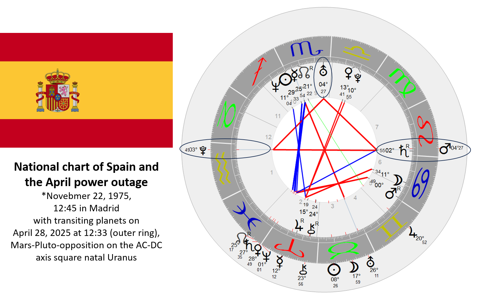 The opposition on April 26 was the third and last one of these two power planets since the beginning of November. Those of you who have planetary placements or sensitive points at the beginning of Leo and Aquarius (and also those with placements at the beginning of Taurus and Scorpio) might have experienced alternating phases of power and powerlessness and attempts of domination since then. If we have taken the low road of these forceful energies, this could have manifested itself in an intense desire for revenge when we have suffered rejection. If we have taken the high road, we might have learned to develop a regal staying power that is in line with evolutionary change. If you feel like you have missed the opportunity to develop some strength along the way, do it like Spain: investigate the reasons for your recent ‘power outage’ during the last Mars-Pluto opposition (which fell exactly on Spain’s AC-DC axis, see below). And then fix the bug to ‘empower’ yourself again. It’s never too late to learn.