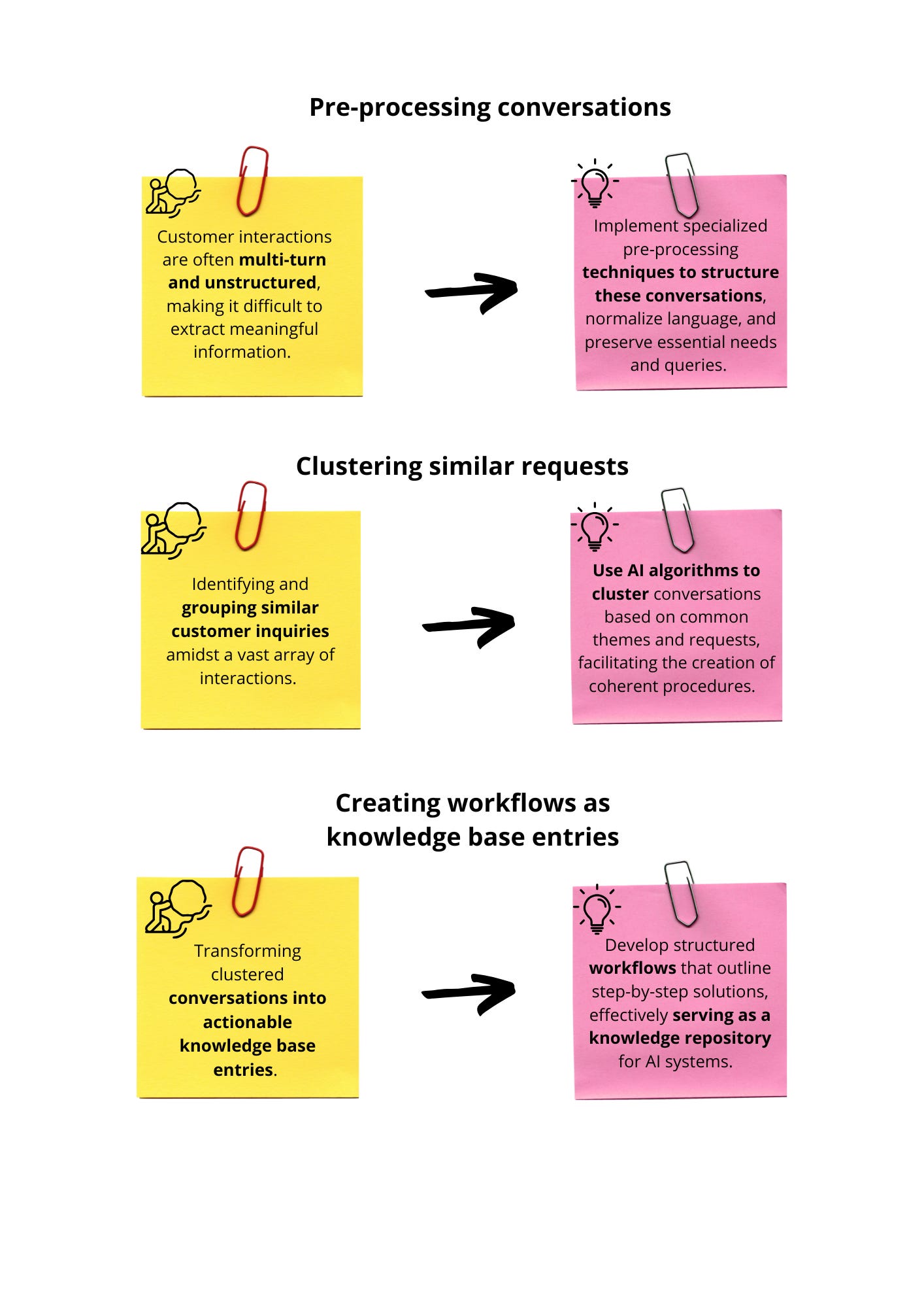 Interaction-Based Knowledge: These systems aim to take advantage of knowledge embedded in customer interactions such as tickets and emails. While it might seem intuitive to use these interactions as a knowledge source, their unstructured and often chaotic nature poses significant challenges.
