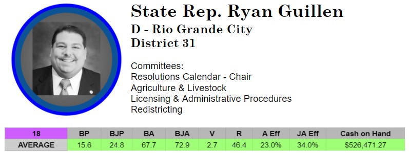 First elected in 2002 at age 24, Representative Ryan Guillen serves 10 counties in southern Texas that make up District 31, covering the vast space between the Valley and San Antonio, including Kenedy County, the 4th least populous county in America with about 400 people. By many metrics, he is the most diligent member of the Texas House, and it isn’t even close, authoring 67 bills per session on average. So when his website claims “no one works harder,” he’s got the numbers to back it up.