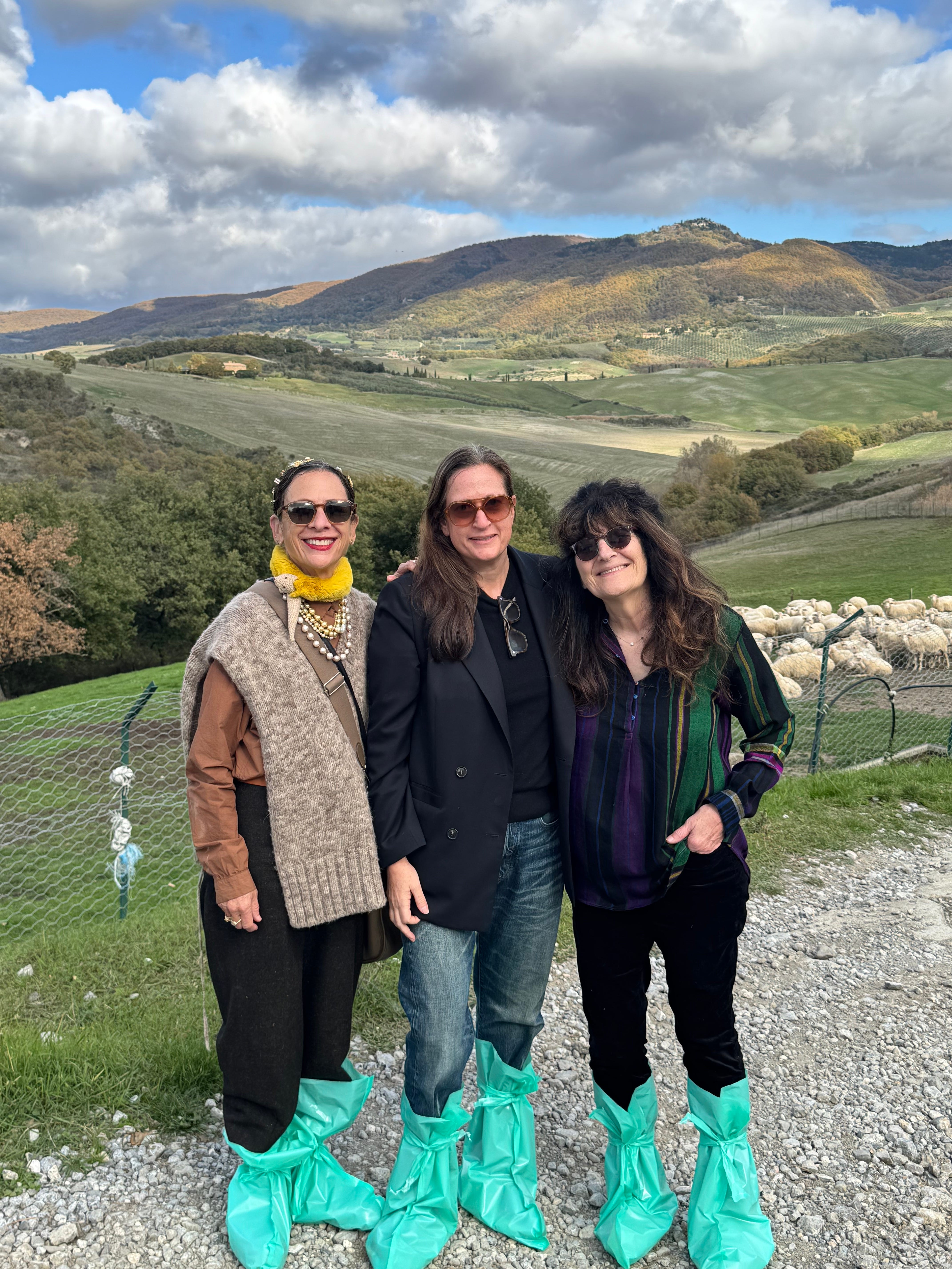 I’m in Tuscany this week, on an eating odyssey with Nancy Silverton and Missy Robbins. Here we are, all geared up to visit the extraordinary cheese producer, Caseificio Piu in the Val d’Orcia.