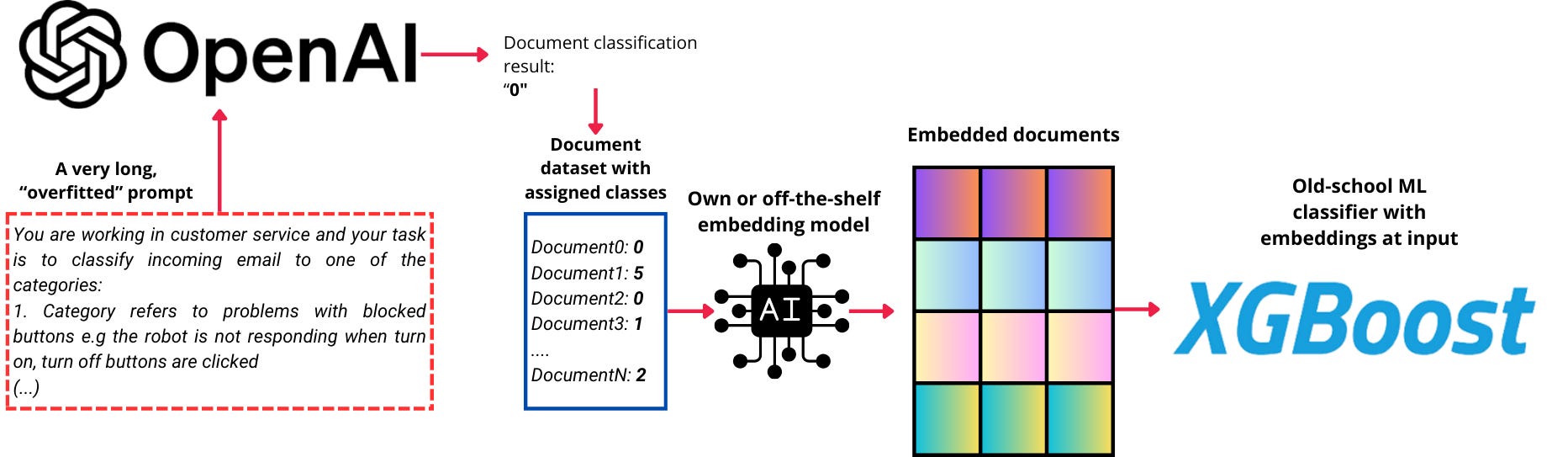 In this article, I demonstrate a solution to the second problem. In the course of our real-life work, we replaced the expensive LLM with a significantly more affordable model. By leveraging the "overfitted" prompts as a source of high-quality training data, we successfully trained a traditional machine learning classifier that performs effectively in production. This approach enables the system to operate at minimal cost.