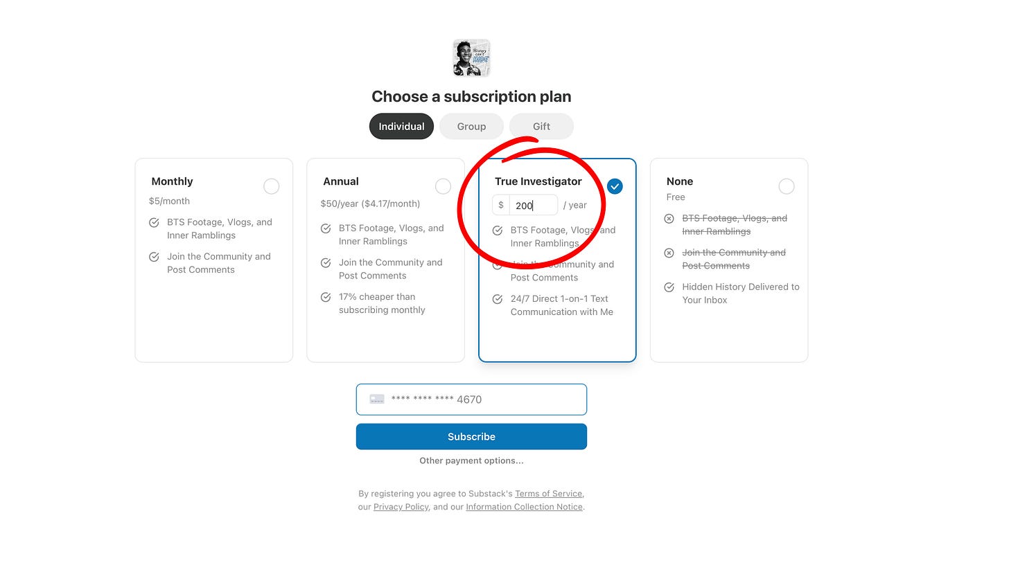 The website default selects the annual plan, but if you want to contribute more, select True Investigator and input an amount in the submission box (see below).