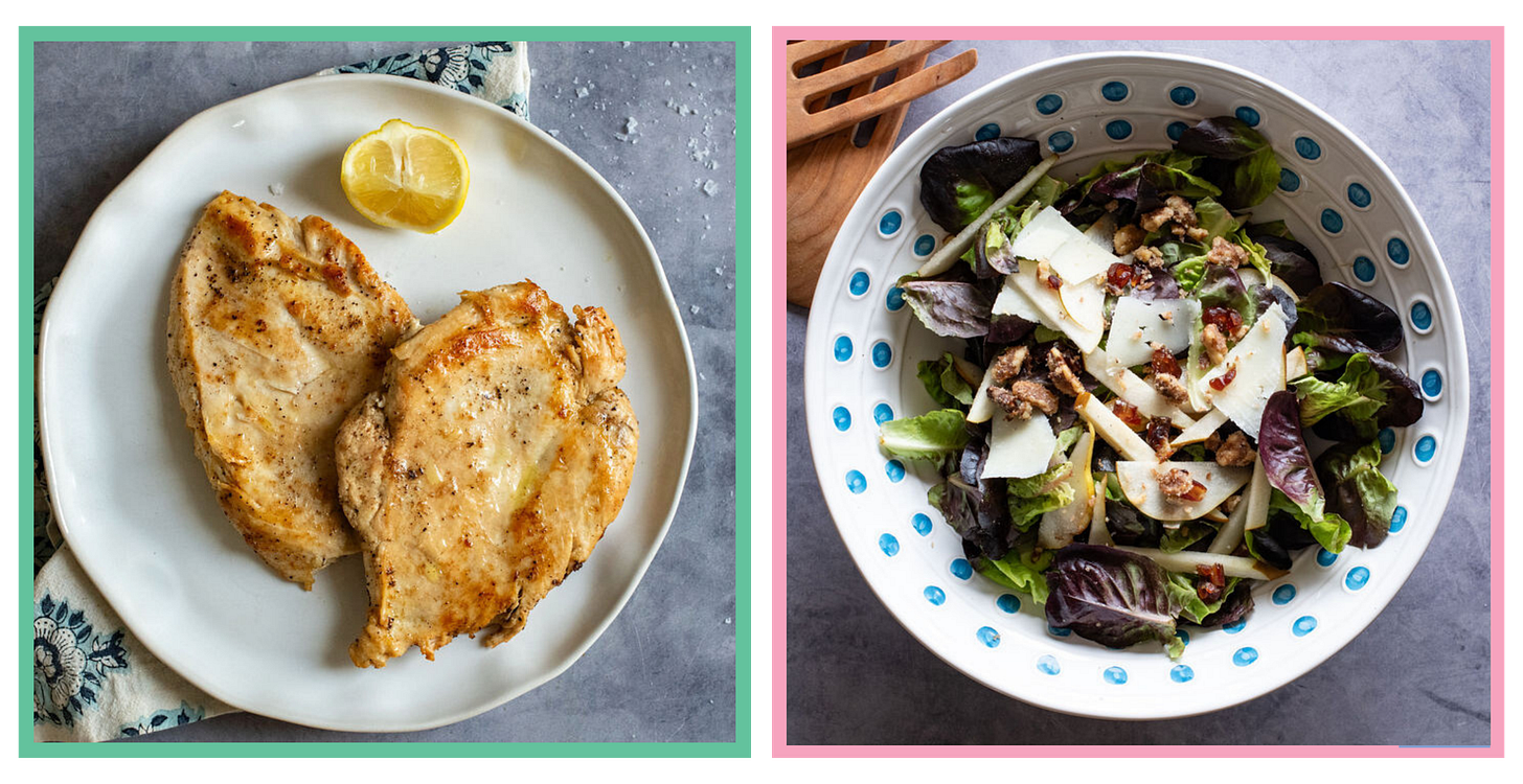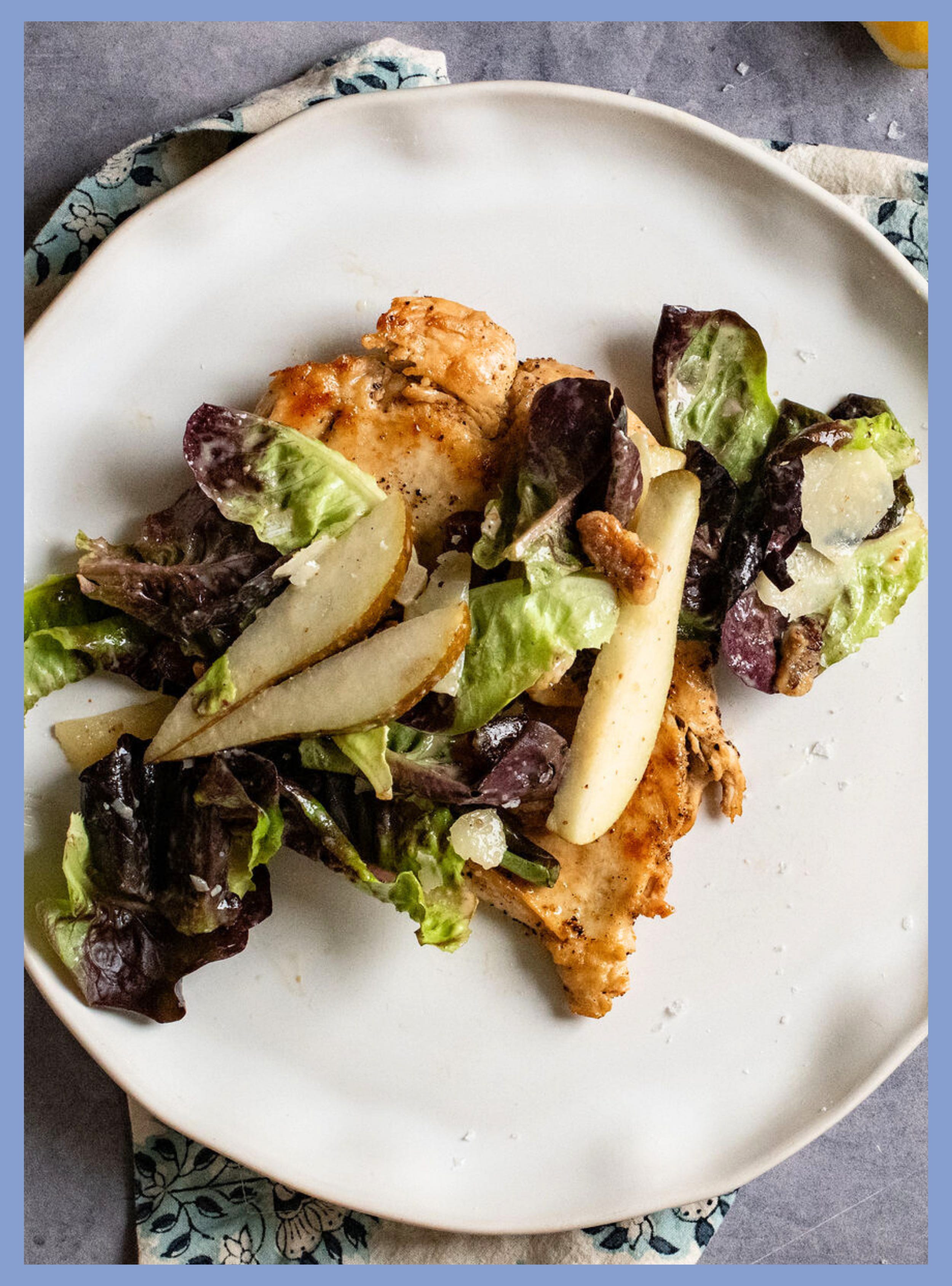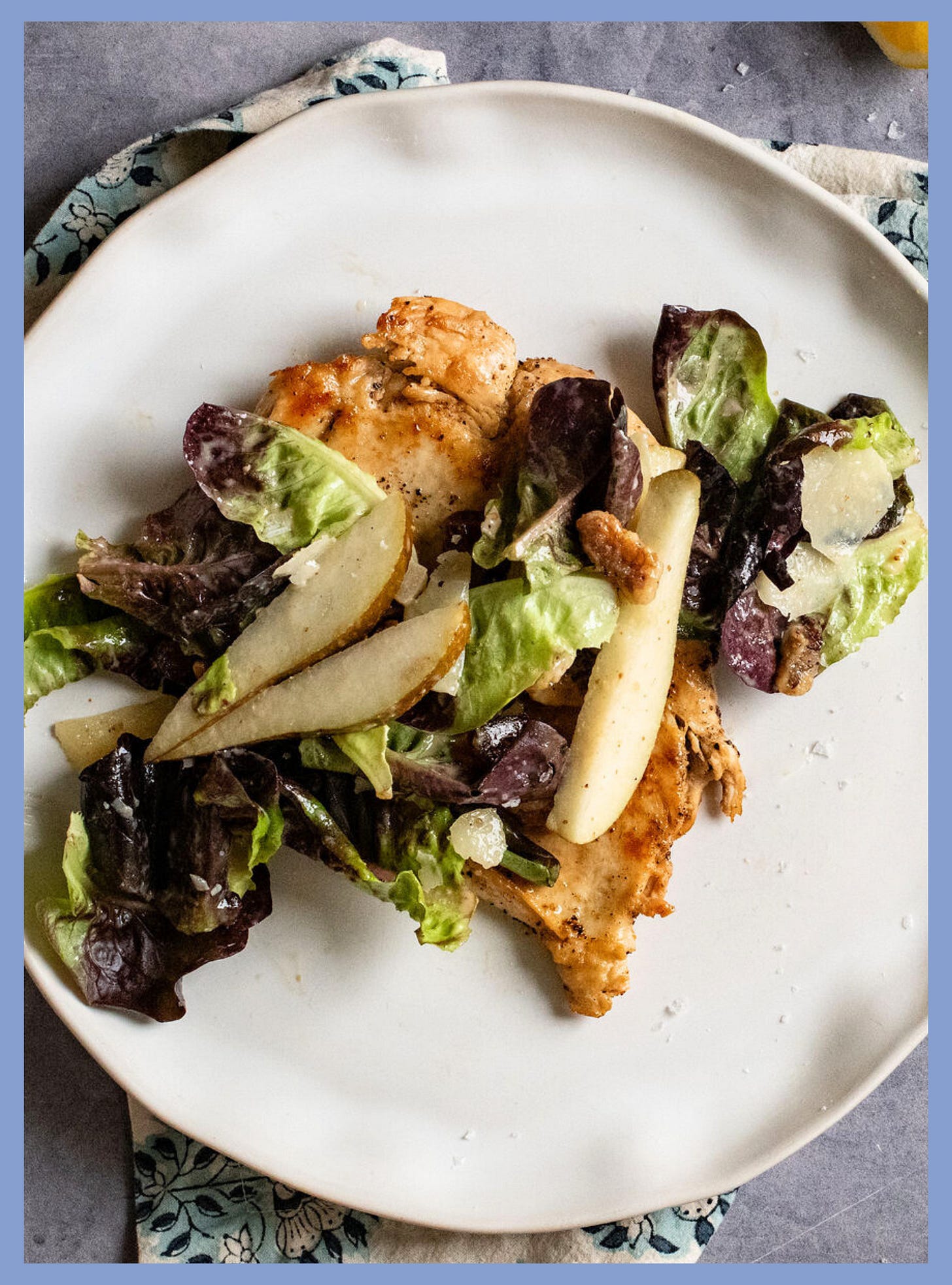 We’re making a pear and manchego salad that has homemade candied nuts and a creamy apple cider tahini dressing. The salad’s amazing with any protein you have or are craving — steak, chicken, shrimp, tofu, a big old roasted turkey perhaps… — but my favorite protein pair for it is chicken paillard! If you’ve never cooked chicken paillard before, you’re in for a treat.
