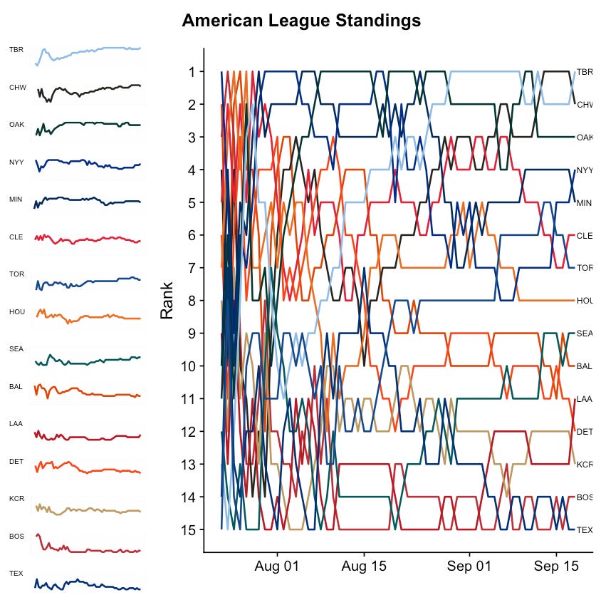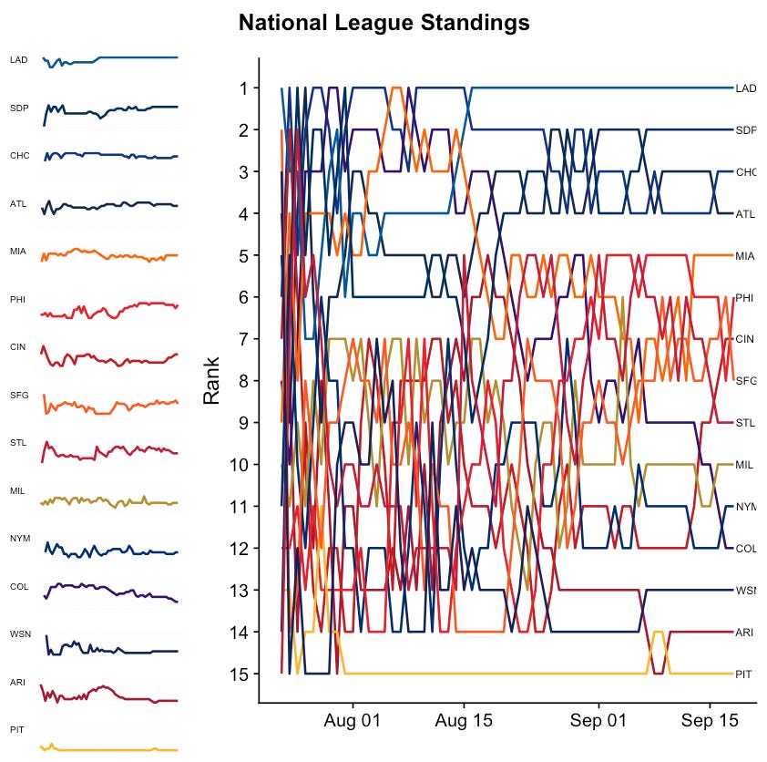 The next two charts show how the AL and NL league rankings have changed throughout the season. You can find a team on the right-hand side in their current ranking position, and trace them back throughout the year to see how they’ve trended. You can also view their trend in isolation on the left-hand side of the figure.