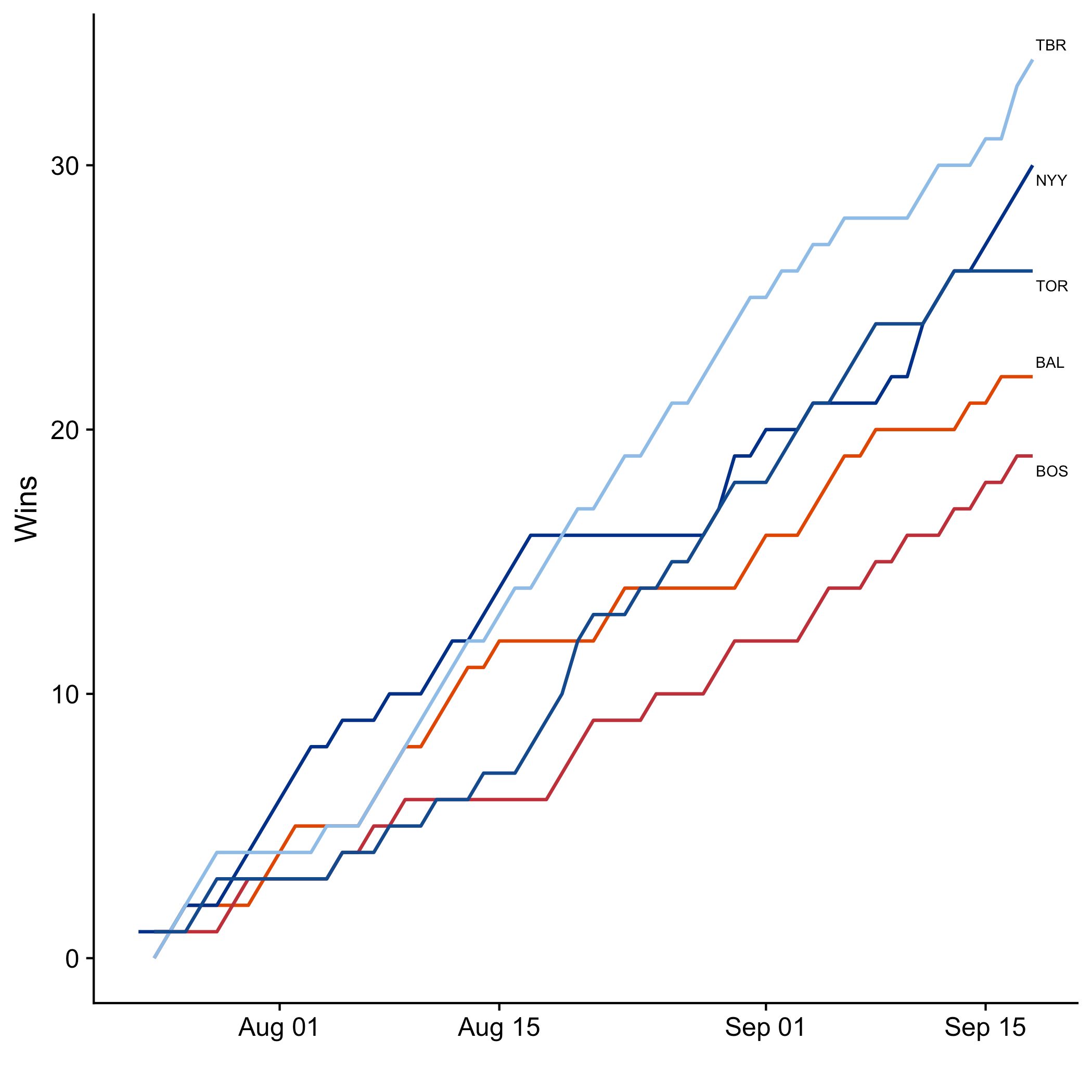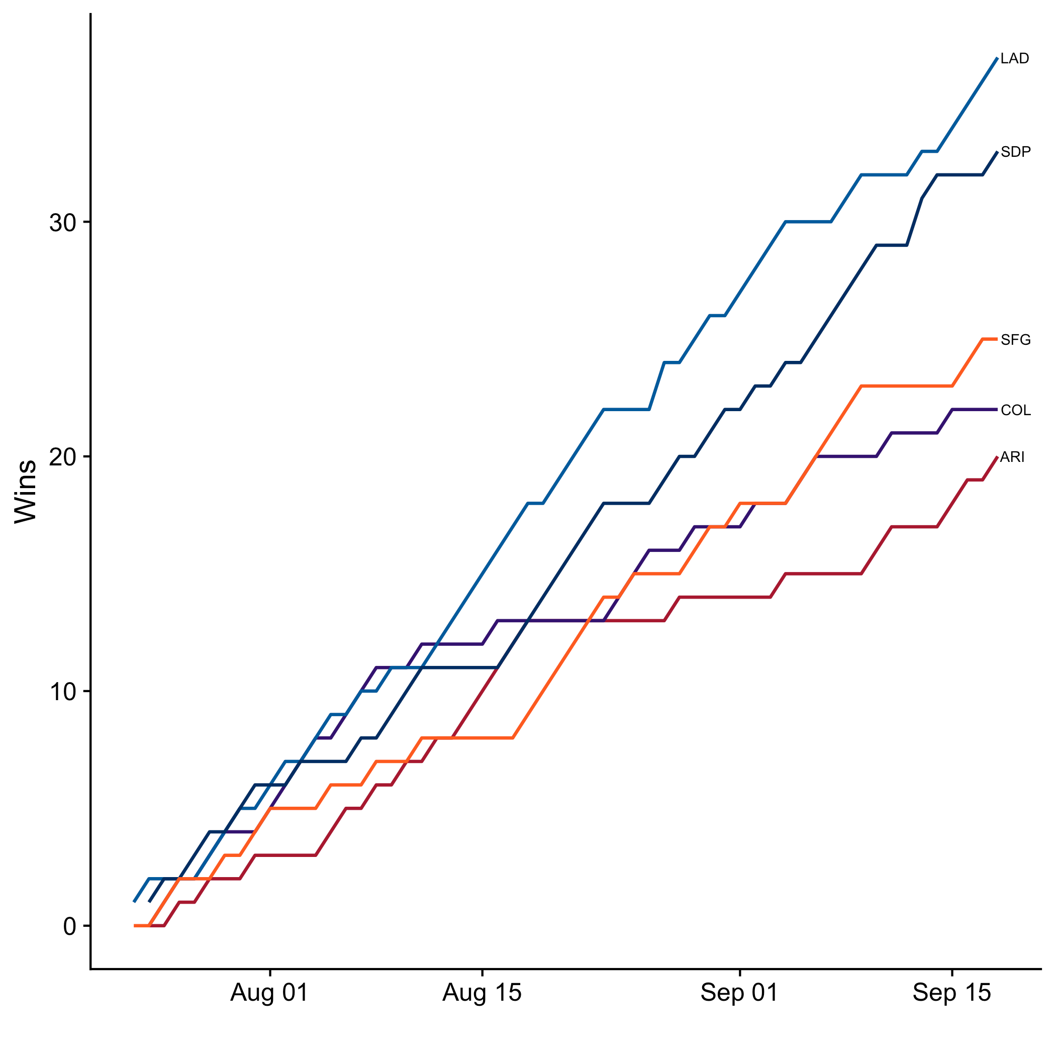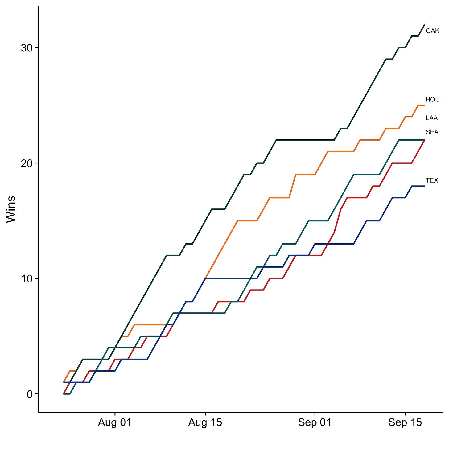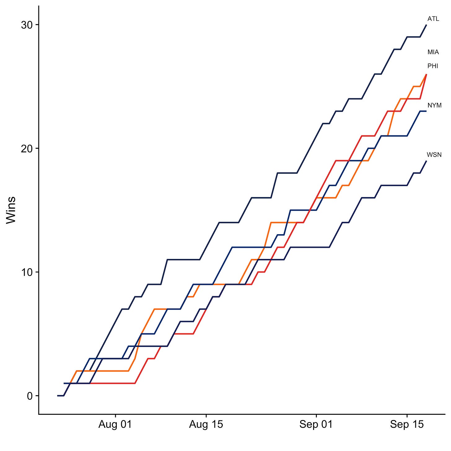 Here’s how the division races look as we head into the final stretch, now showing wins over time instead of rankings. While some teams have already clinched their spot (the Dodgers, White Sox, Rays, and A’s are all already in), many divisions and wildcard spots remain up for grabs. Note that while the charts below are my own, I’ve copied the division standings tables below them directly from Google’s standings page.