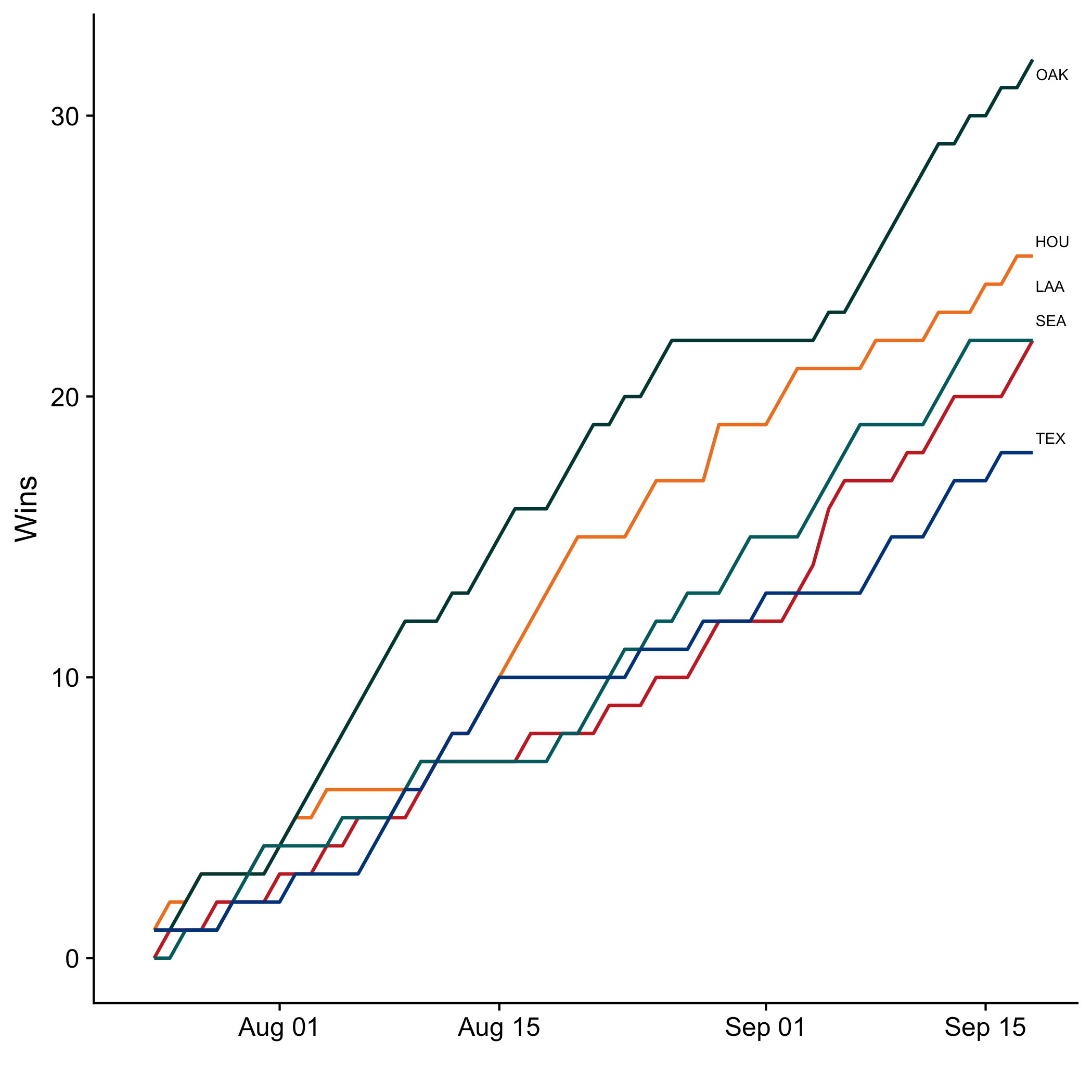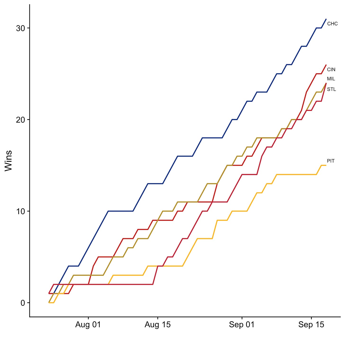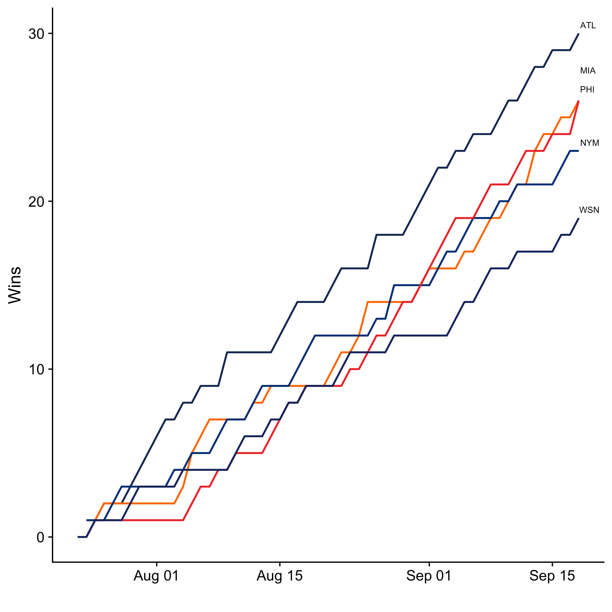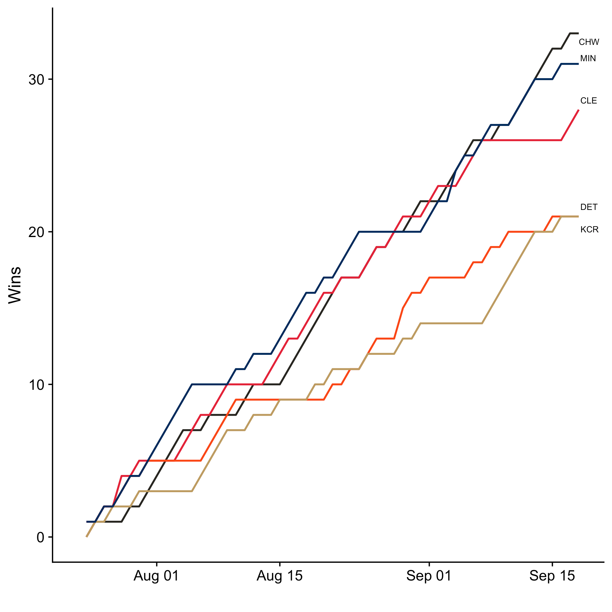 Here’s how the division races look as we head into the final stretch, now showing wins over time instead of rankings. While some teams have already clinched their spot (the Dodgers, White Sox, Rays, and A’s are all already in), many divisions and wildcard spots remain up for grabs. Note that while the charts below are my own, I’ve copied the division standings tables below them directly from Google’s standings page.