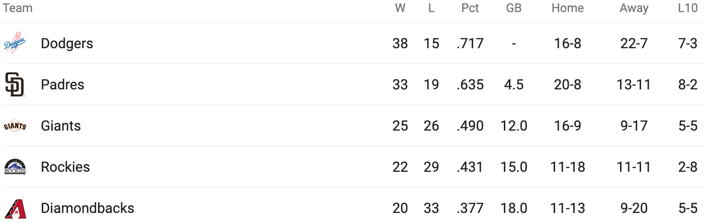 The standings are noisy to the point of not being interpretable in the beginning of the season. I think that’s a feature, not a bug. It’s easy for a team to look better or worse than it it actually is during a small stretch of games. As the year moves forward, these small, random variations in team performance start to smooth over, and teams start to settle in a more stable region in the standings that’s more reflective of their true ability.