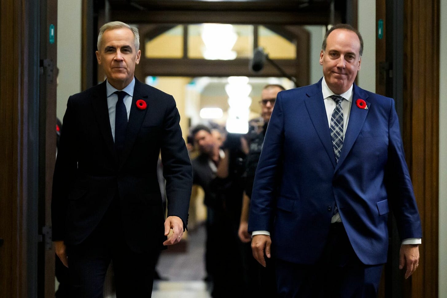 Prime Minister Mark Carney walks with MP Chris d’Entremont, who recently crossed the floor from the Conservative caucus to join the Liberals. (Justin Tang/Canadian Press)