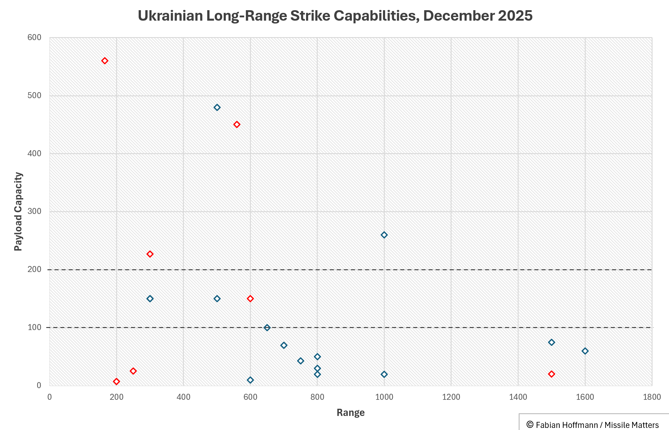 The image above provides an overview of Ukraine’s conventional long-range strike arsenal at the end of 2025 by plotting individual missile and long-range drone systems according to their range and payload capacity. Imported systems are indicated in red; indigenously produced ones in blue. For readability, the graph omits the FP-5 “Flamingo”, which is an outlier due to its outsized payload and range (1,150 kilograms and 3,000 kilometers), but it is discussed below.