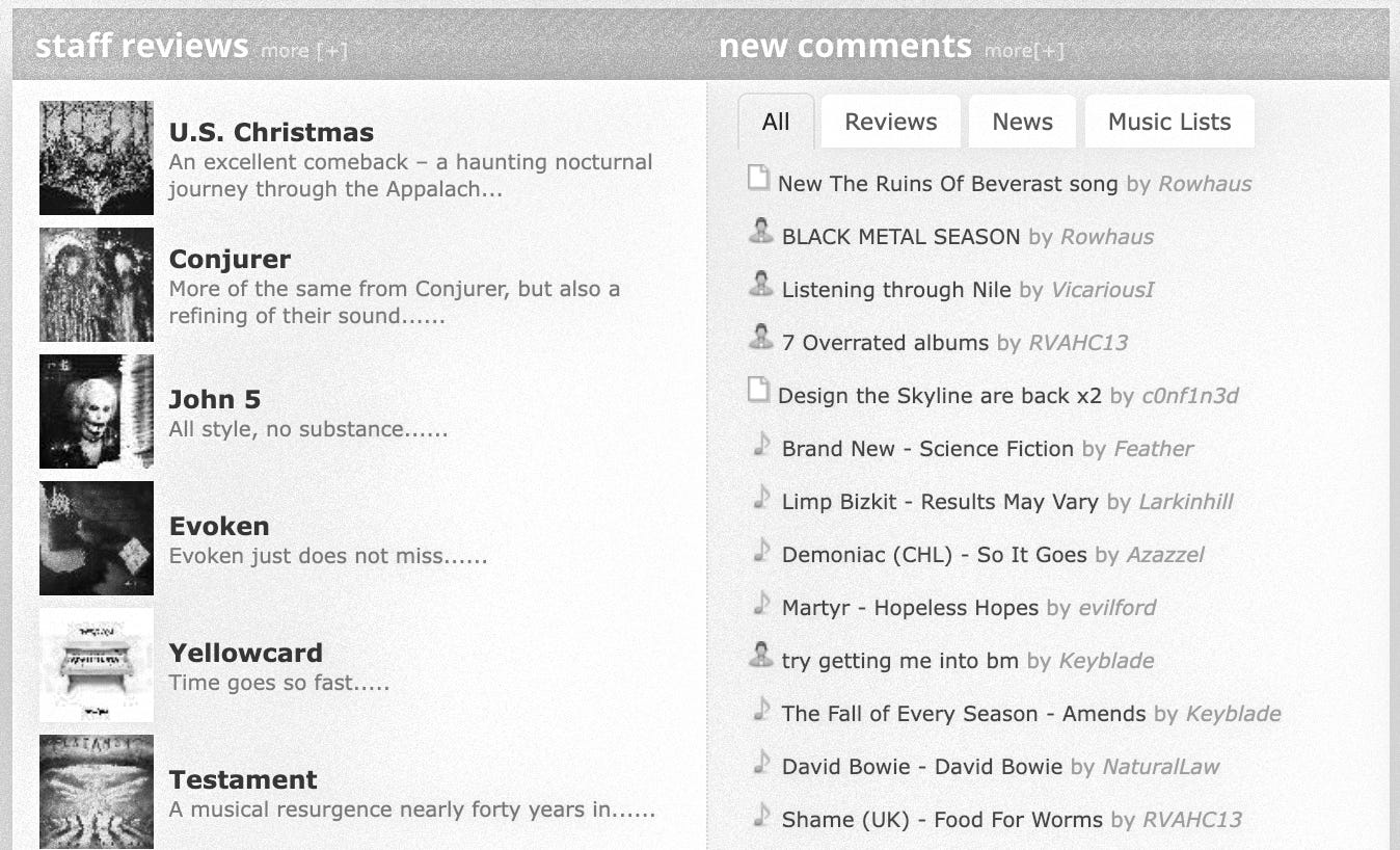 In the aughts, “somewhere else” could mean a lot of different things. There were forums dedicated to particular artists, like the one attached to the Radiohead fan site atease, or Collected Animals. There were Pitchfork competitors like Stylus or Coke Machine Glow. Some writers, both of the professional and aspirational variety, talked shop on a barebones UK-based forum called I Love Music. Others would eventually congregate on Tumblr, which was, for a time, a hotbed of influential music criticism. Today, there are Discord servers, well-moderated subreddits, and stubbornly free-standing websites like Rate Your Music and Sputnik.