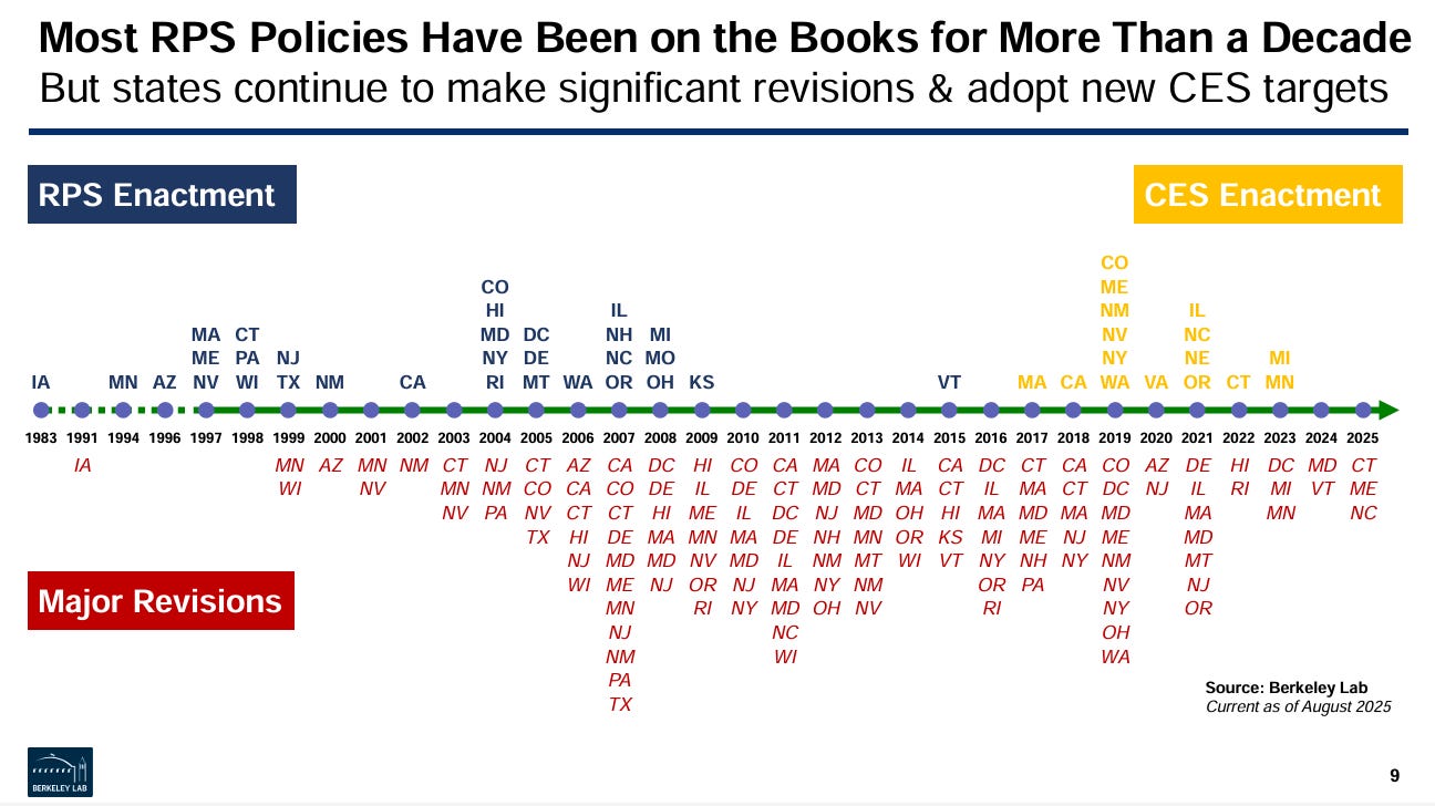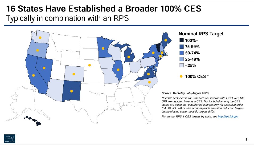 As of August 2025, 28 states and Washington, D.C., had renewable energy mandates, which are frequently carve-outs for wind and solar generators, and 16 states had layered on an additional 100 percent carbon-free electricity mandate, which often includes nuclear power, large hydroelectric providers, geothermal, and carbon capture and sequestration as part of a larger suite of low or zero-carbon technologies.
