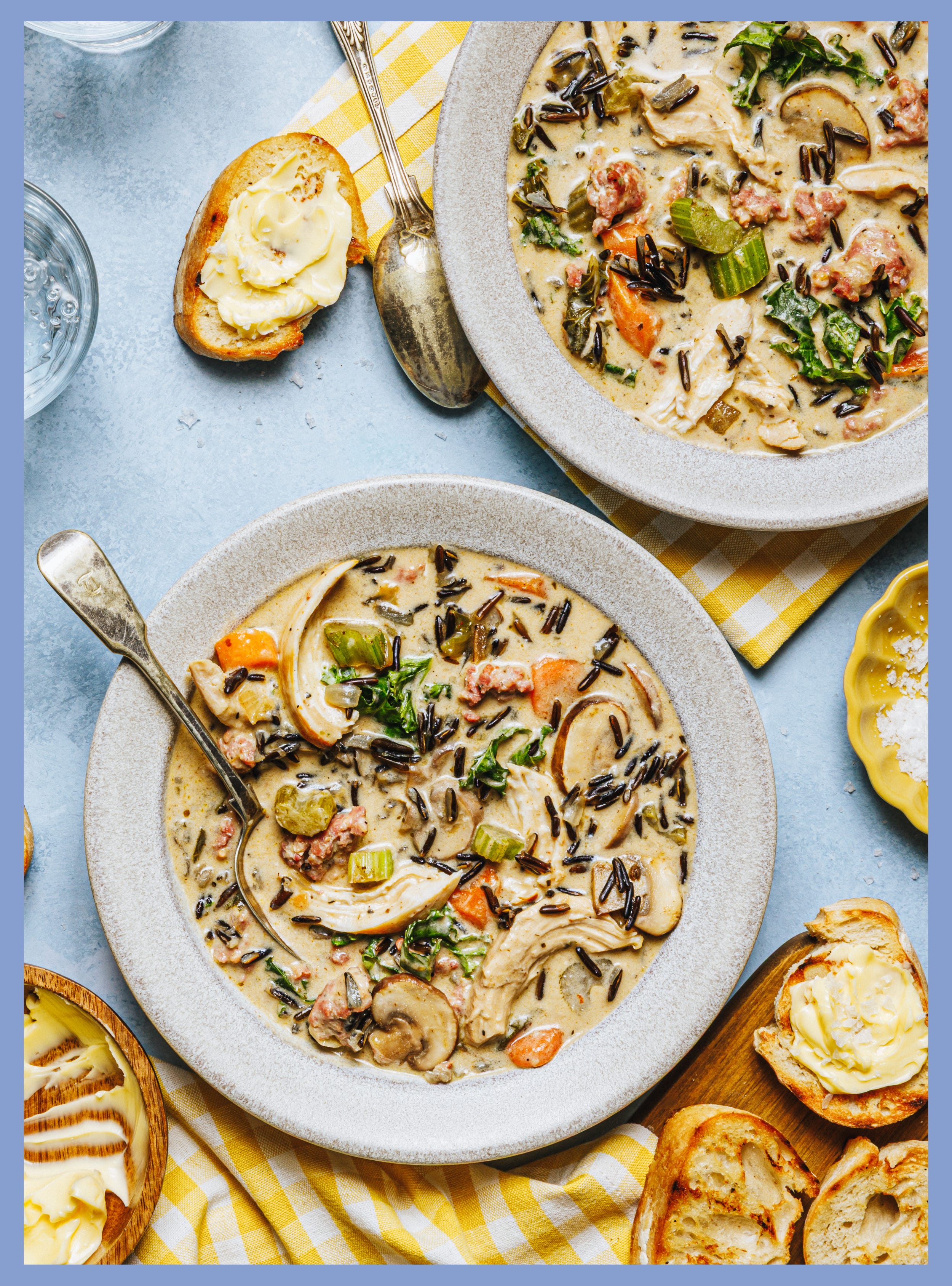 This is my take on the classic wild rice and leftover-turkey soup my mom made the day after Thanksgiving every year growing up. It’s so creamy, so flavorful, so easy. If you don’t have leftover turkey, no prob. It’s just as good with shredded rotisserie chicken — or you could use raw chicken thighs or breasts instead (see the notes beneath the recipe for more on that!). We’re combining our lean white meat with wild rice, Italian sausage, and a ton of veg and spices for a nourishing, flavor-packed, filling bowl of soup. You all went crazy for good soup a few years ago and this recipe — with its nutritious grain and flavorful proteins and produce — could be a sister to it!