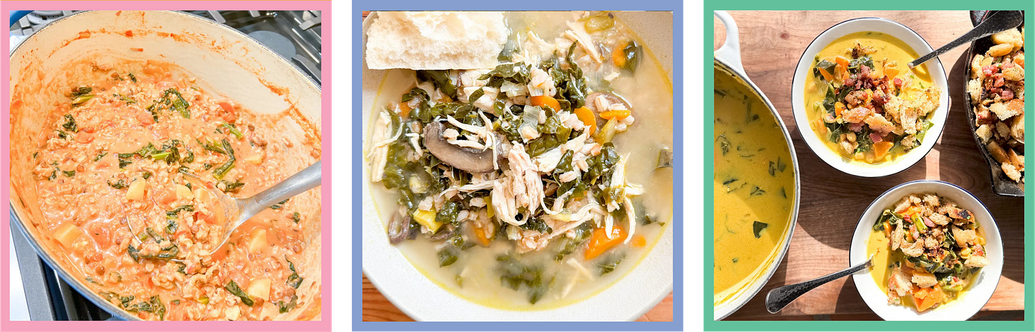 Here are a few more soups that totally classify as a full meal, and that will warm your bones all fall and winter long: winter stew; chicken, mushroom, and farro soup; and good luck soup.