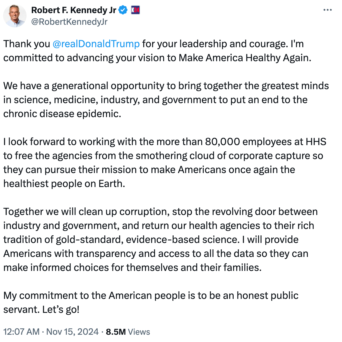 After months of closely following developments in American healthcare, I want to explore a story that's being overshadowed by controversy: Robert F. Kennedy Jr.'s recent appointment as head of the Health and Human Services (HHS) under Trump’s administration, and his vision for transforming the medical system.