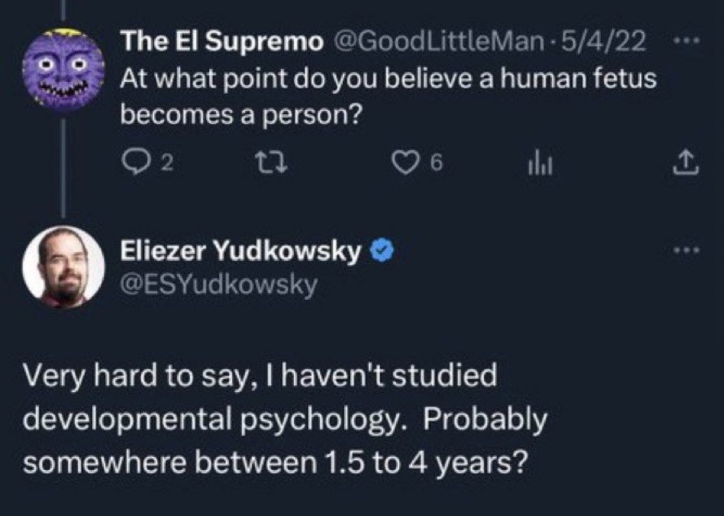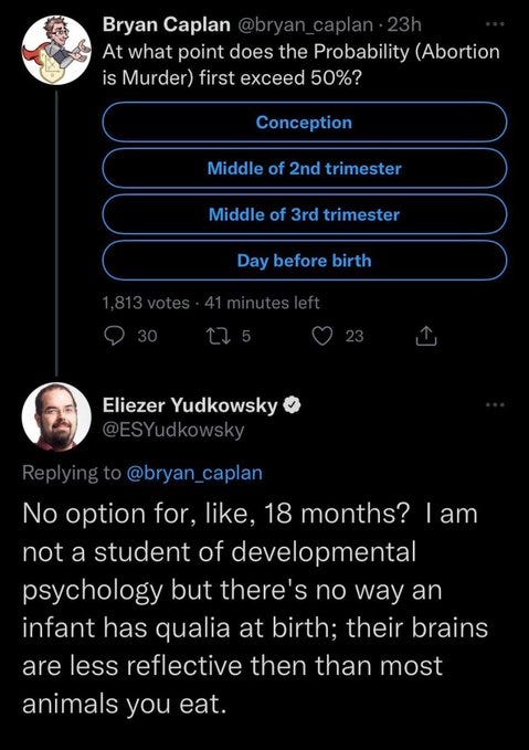 Lots of people on Twitter are taking swings at Eliezer for his claim that chickens, newborn babies, and other animals we eat are probably not conscious. Many people’s takeaways have been that because Eliezer has nutty views on animal consciousness, you shouldn’t take seriously his views on other things.