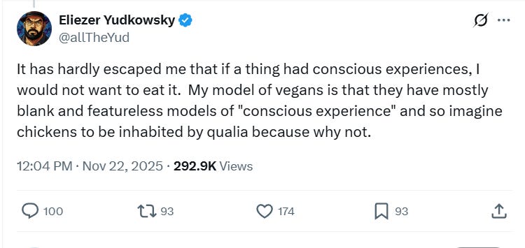 Eliezer’s views on animal consciousness are completely ridiculous, especially as justification for not being vegan.