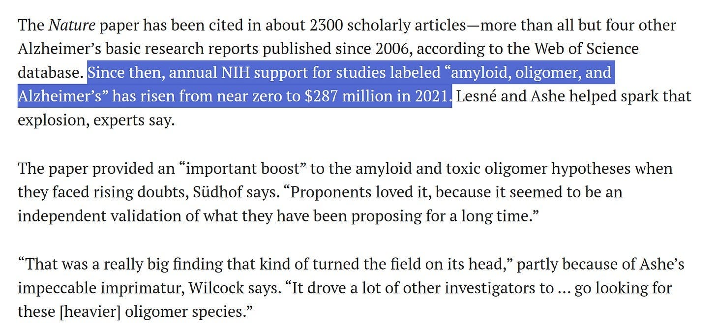 The famous 2006 Alzheimer’s paper that turned out to be likely fraudulent was cited over 3,600 times according to Google Scholar. 414 of those citations occurred since 2021, starting 15 years after the paper was published. Here’s the historical pattern (and keep in mind that mid-2022 was when the potential fraud was uncovered):