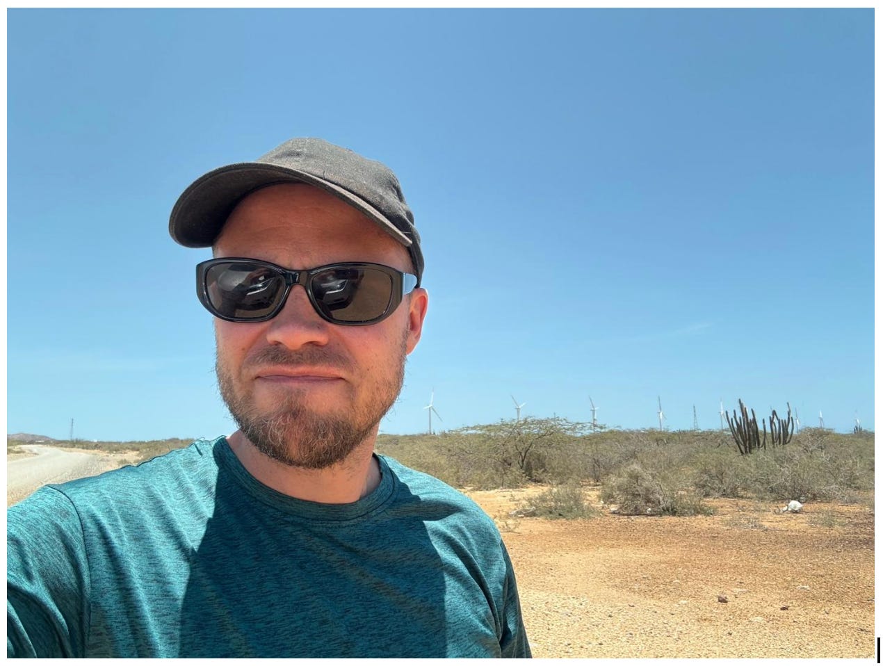 Professor Johannes in front of the inactive Jepirachi wind farm in northernmost La Guajira. The 20-megawatt wind farm started in 2004 but stopped operations in 2023 because of updated government regulations. It is being decommissioned as of September 2025.