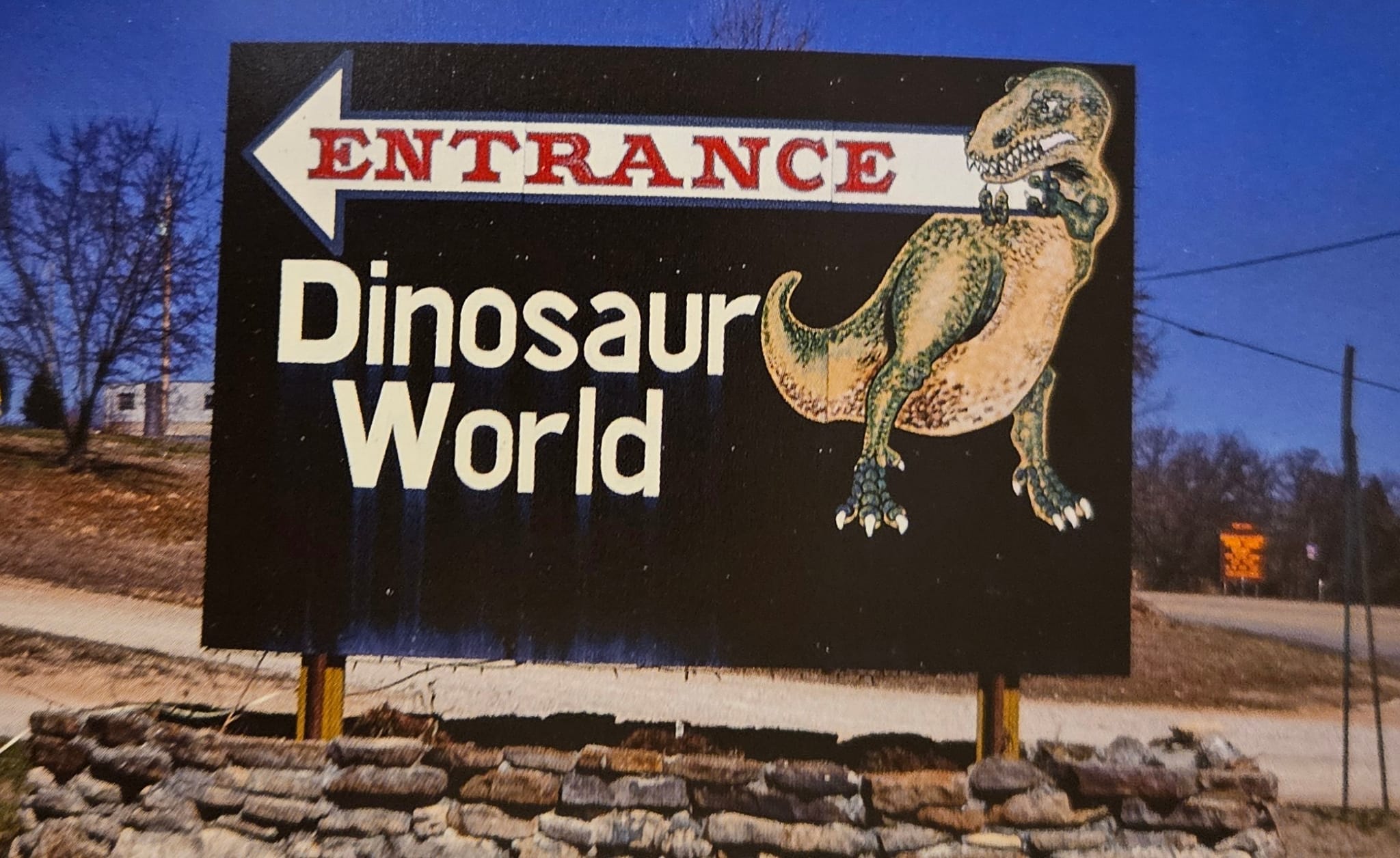 This was once the largest roadside dinosaur park in the world, a place advertised by a small card size flyer featuring Ola—a big man with a shock of white hair dressed like Johnny Cash hand-feeding feeding his pets—a cat, dog, deer, and what appears to be a monkey with—“The Dinosaur Park”as superscript