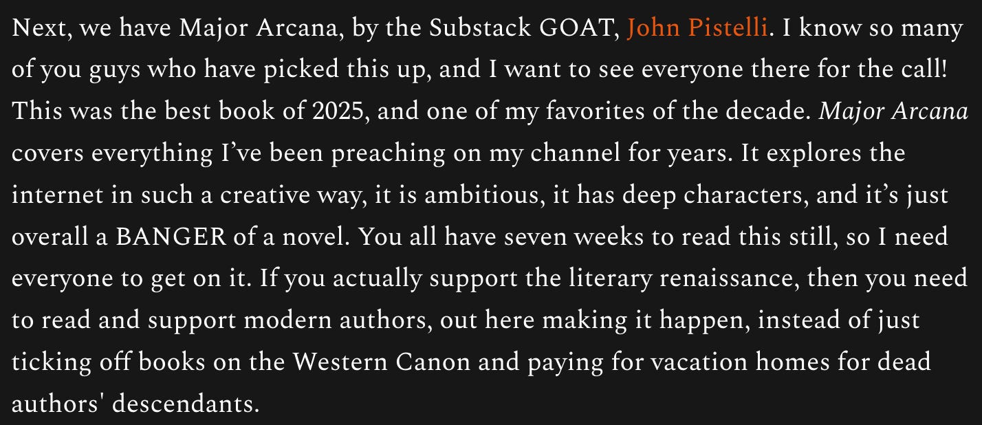 In January, Ian Cattanach, impresario of the literary renaissance, will give my new novel Major Arcana the book club treatment, as advertised in the screenshot above. I’m honored to appear next to Tolstoy’s Confession, Mishima’s Sailor, Joyce’s Portrait, and McCarthy’s Horses.1 If you’d like to participate, or just to understand why some feel that Major Arcana merits such company, you can order the book in all formats (print, ebook, audio) here; you can also find it in print wherever books are sold online. You can buy it directly from Belt Publishing, too—we receive more of a profit that way—or you might also suggest that your local library or independent bookstore acquire a copy. Please also leave a Goodreads, Amazon, or other rating and review. Thanks to all my readers!