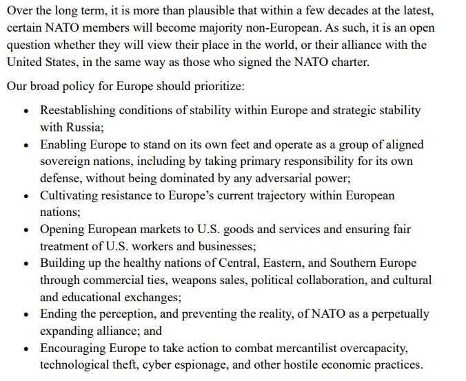 One thing that stands out (and we can see it in other recent moves such as the Trump administration weakening its already pathetic sanctions on Russia, cozying up to China, sandbagging Ukraine and Europe, and weakening its commitment to NATO) is that the administration is being more and more open about its intentions. This new strategy is a return to JD Vance’s speech in Munich which was delivered not long after the administration came to power. This speech, if you remember, caused consternation amongst some Europeans who had not yet grasped what the administration believed. You can watch the whole speech here if you really want to.