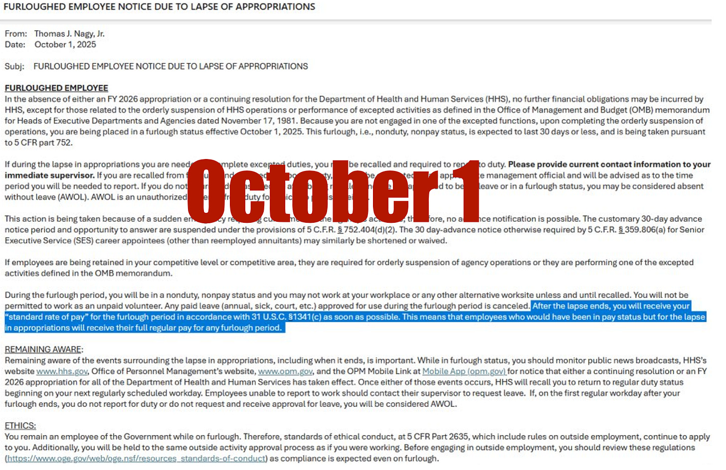 In the first email, dated October 1, the memorandum clearly stated that HHS employees would receive full pay for the entirety of the shutdown period once it ends—that is, paid furloughs.