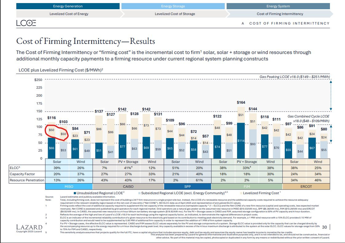 So you can imagine our delight last week when we identified an error in their LCOE+ report regarding the company’s calculations of its cost of “firming” wind and solar resources, and they were forced to issue a correction to their slides. Sadly, they did not mention that they corrected their slides or credit us for finding the error.