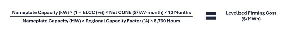 Lazard assesses the firming cost based on the capacity value of a resource (generally expressed as Effective Load Carrying Capacity, or ELCC) and the net Cost of New Entry (CONE) costs, expressed in dollars per kilowatt-month, published by grid operators for each regional market to determine the cost of new capacity in these markets. The equation can be seen below.