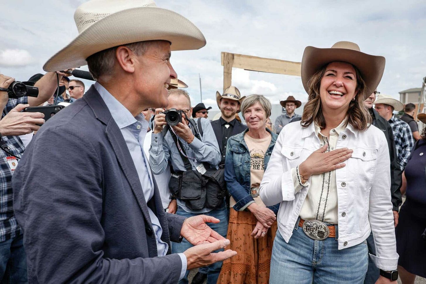 Mark Carney with Danielle Smith at the Stampede breakfast in Calgary, Alberta, July 5, 2025. (Jeff McIntosh / Canadian Press)